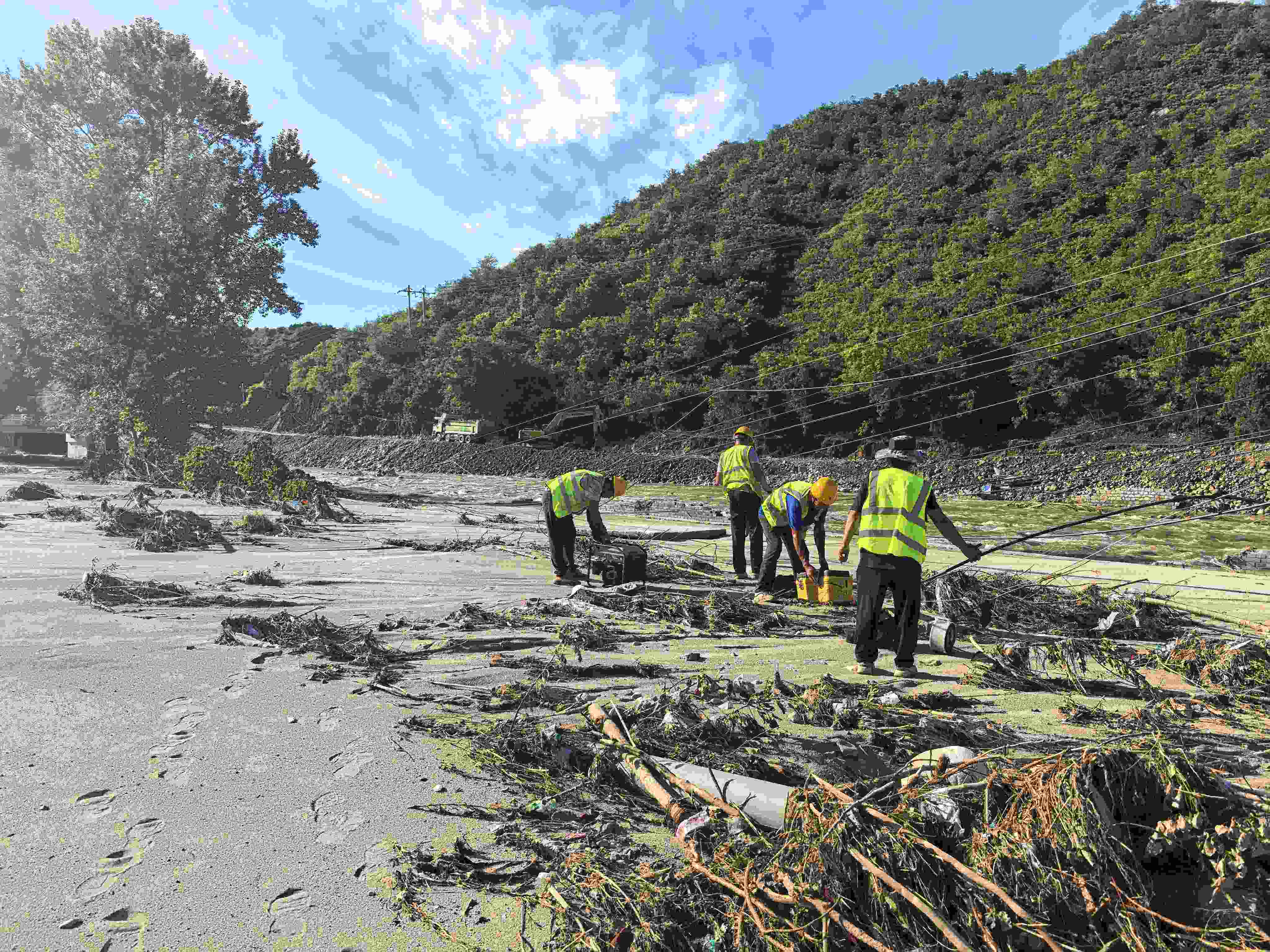 搶修過程中,同志們克服道路被洪水淹沒、交通被山體滑坡阻斷,大型搶修設(shè)備難以抵達現(xiàn)場等等困難,身背肩扛著搶修物資,徒步穿梭在泥濘崎嶇的山間小道,爭分奪秒搶通受損路線。